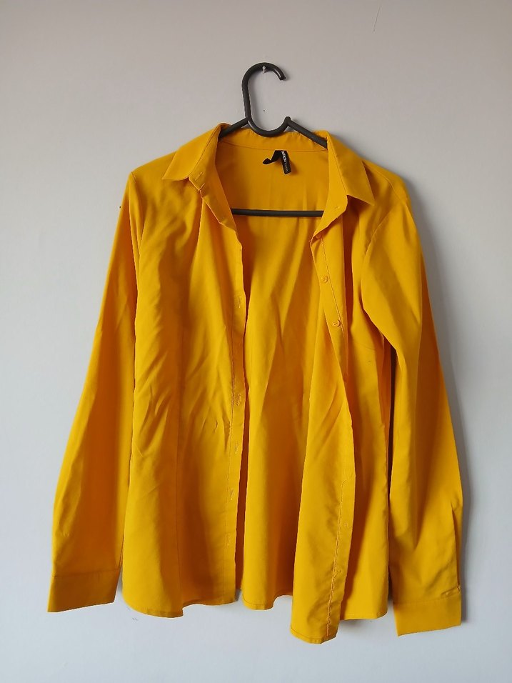 Sarı, uzun kollu ve yakası kesimli gömlek.