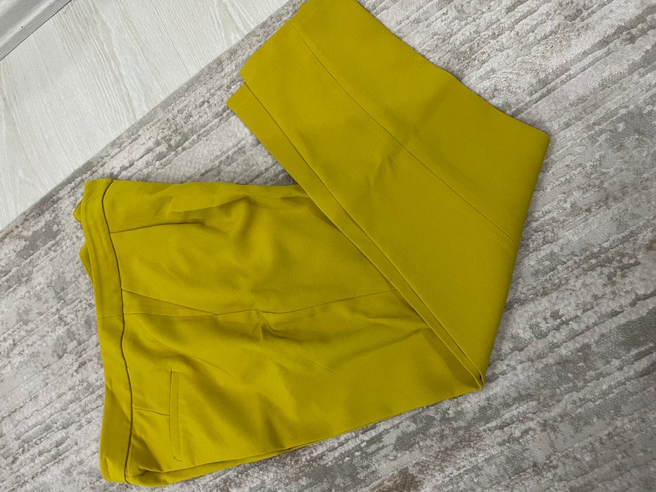 Parlak sarı renkte, fermuarlı detaylı, normal boy midi kumaş pantolon. Günlük kullanıma uygun sade ve rahat bir stil sunar.