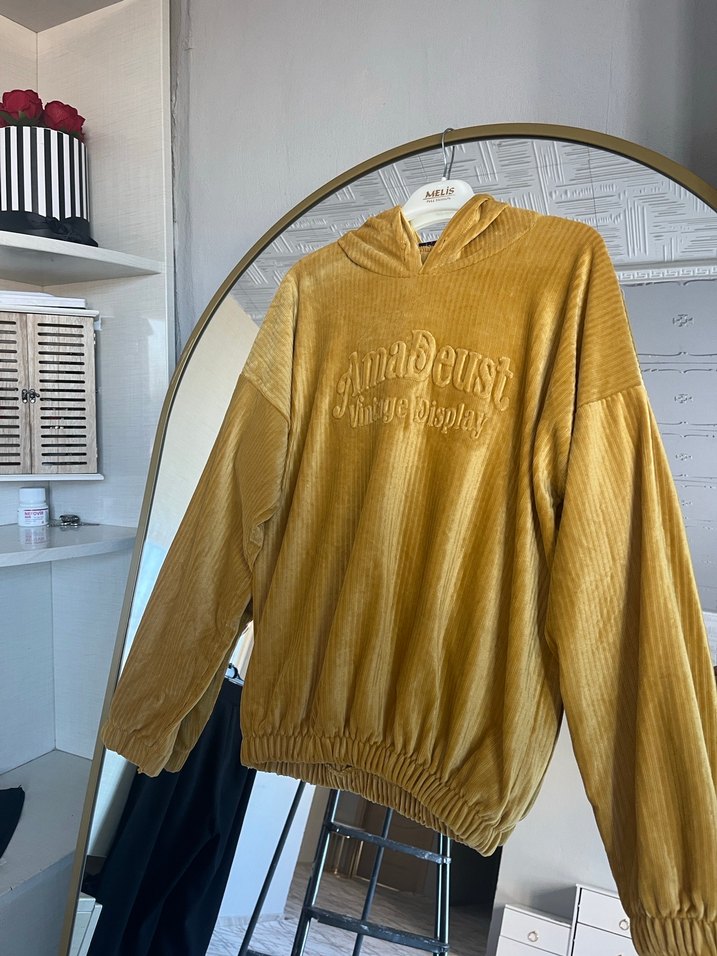 Sarı renkte, uzun kollu ve bol kesim kadın sweatshirtü, yumuşak örme kumaştan üretilmiştir. Yuvarlak yaka ve parlak baskı detaylarına sahip, rahat günlük kullanım için uygundur. Elastik bel detayı vardır.