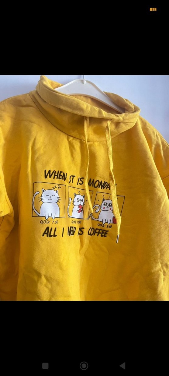 Bol kesim, uzun kollu, bisiklet yakalı sarı sweatshirt. Renkli baskılı kedi desenleri ve 'WHEN ST IS MONDA ALL I NEED IS COFFEE' yazısı içerir. Yumuşak kürk dokulu kumaştan, fermuarlı ve günlük kullanıma uygundur. ☕