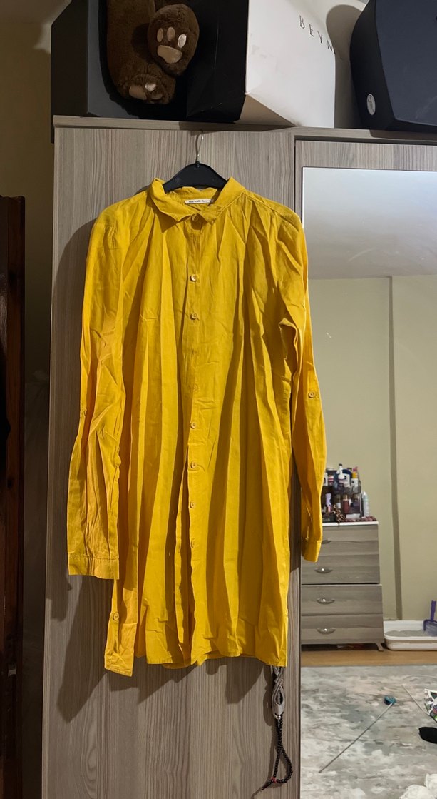 Salaş kesim, uzun kollu, yakalı ve düğmeli sarı keten tunik, günlük rahat kullanım için uygundur. Lc marka İki kol arası 49 cm Tunik boy 80 cm