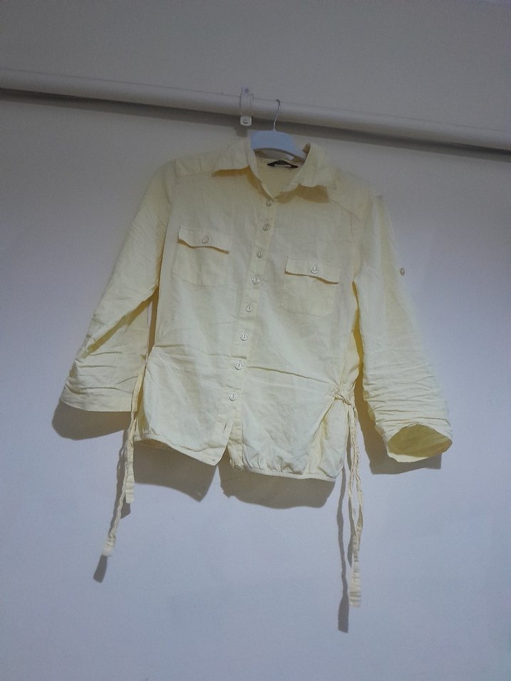 Sarı keten kumaştan, düğmeli ve yakalı uzun kollu kadın gömleği. Rahat ve salaş kesimiyle günlük sokak stiline uygun. iki kol arası 48 santim boy uzunluğu 55 santim