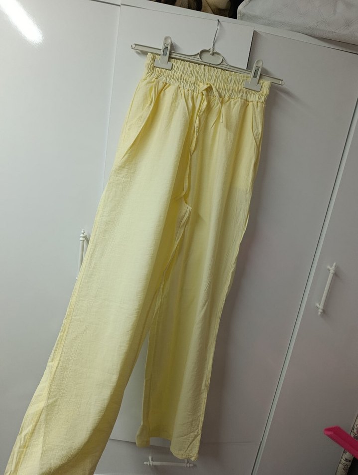 Sarı keten kumaştan, pilili ve bol kesim kadın pantolon. Rahat ve nefes alır özellikte, günlük kullanıma uygun.