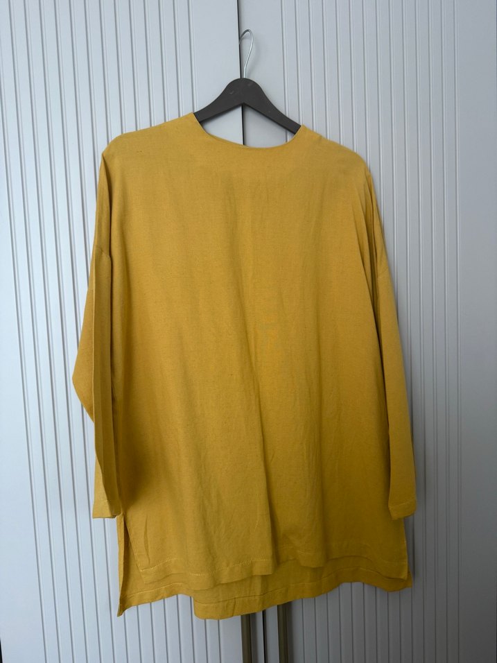 Sarı renkte, keten kumaştan, uzun kollu, yuvarlak yakalı ve bol kesim kadın tunik. Parlak, desensiz ve midi boyda, günlük kullanıma uygun. MinikTerziden alınmıştır