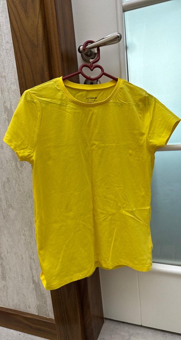 Sarı, kısa kollu, yuvarlak yakalı ve pamuklu kumaştan yapılmış kadın tişörtü. Düz ve midi boyda, minimalist sokak stili için uygundur. 13- 14 yaş ama s beden bana oluyor