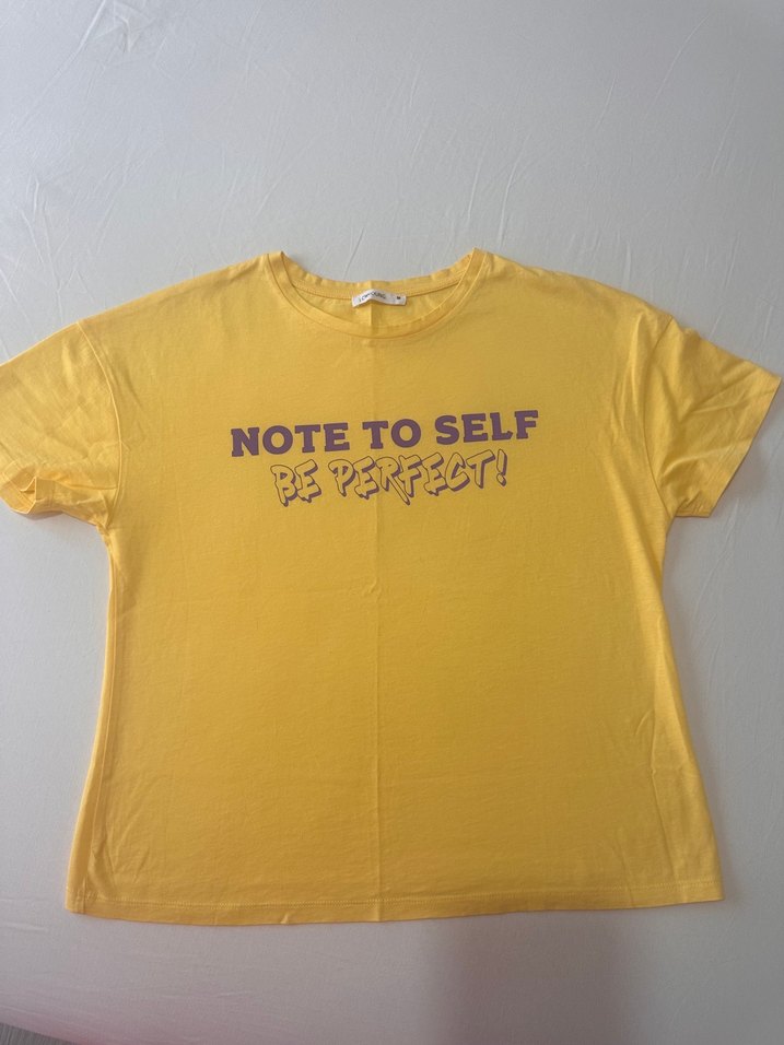 Sarı renkli, kısa kollu, yuvarlak yakalı ve bol kesim kadın tişörtü. "NOTE TO SELF, BE PERFECT!" baskılı, rahat sokak stili. Yumuşak sentetik kumaştan, günlük kullanıma uygun midi boyda.