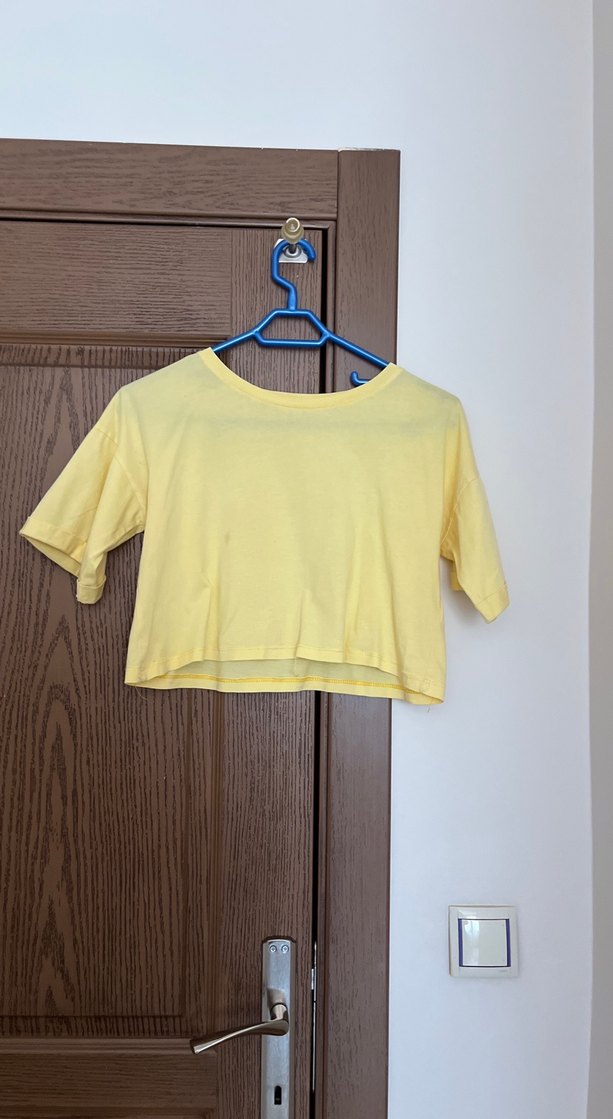 Yumuşak keten kumaştan, yuvarlak yakalı ve kısa kollu, bol kesim sarı crop top. Pastel tonu ve minimalist tarzı gündelik sokak modasına uygundur.