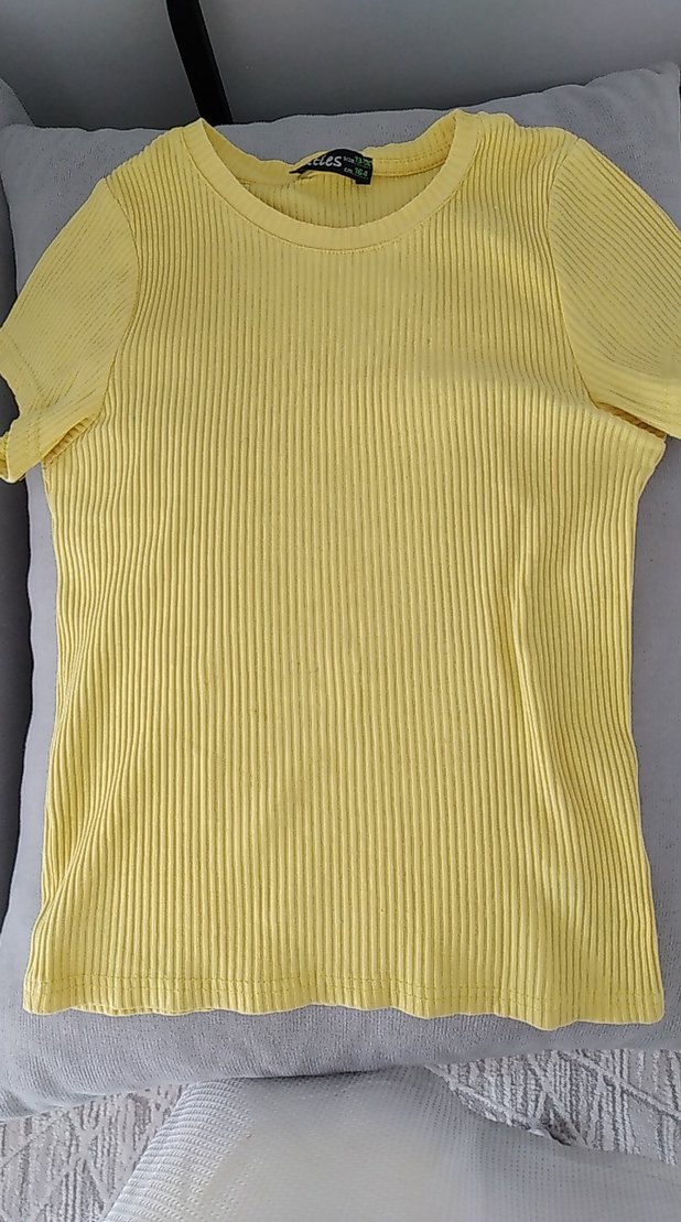 Sarı renkli, kısa kollu, fitted kesim çocuk tişörtü. Yumuşak sentetik kumaştan yapılmış, pliseli dokusu ve pastel tonu ile minimal tarz sağlar.