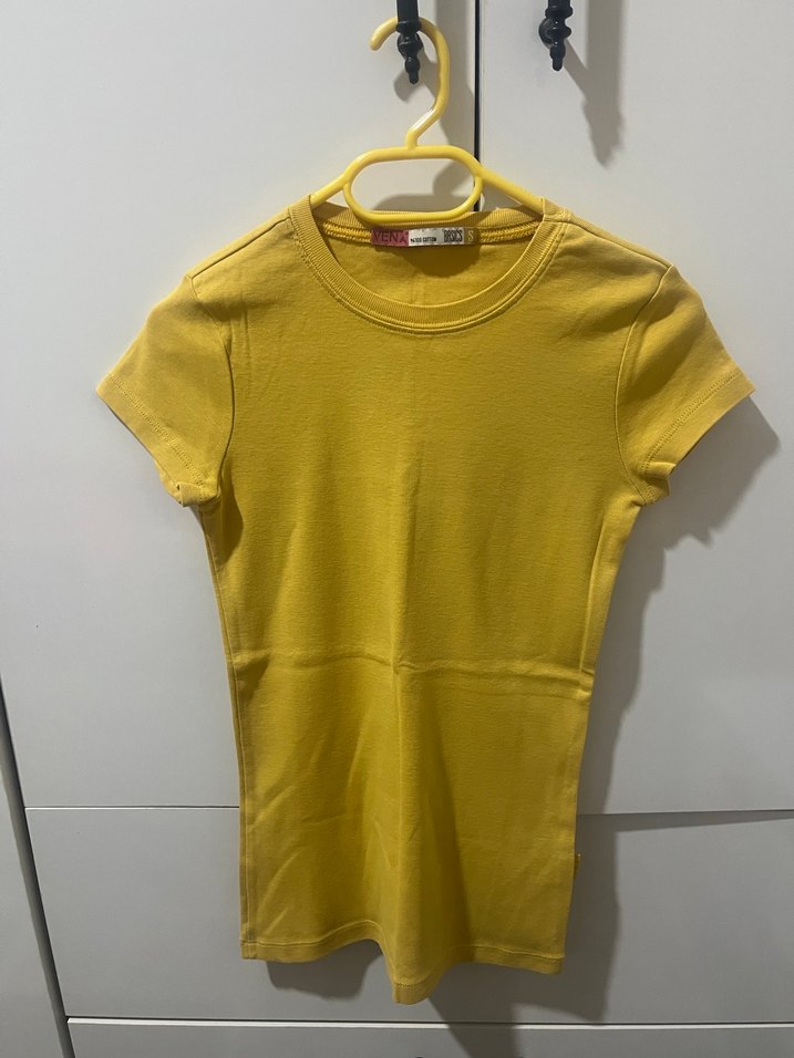 Sarı, kısa kollu, yuvarlak yakalı, vücuda oturan kadın tişörtü. Yumuşak sentetik kumaştan üretilmiş, günlük sokak stili için uygundur.