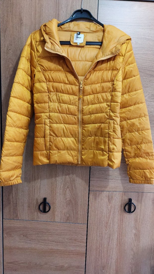 Parlak sarı renkli, sentetik kumaştan yapılmış, fermuarlı ve kısa kesim kadın kışlık mont. Rahat ve şık sokak stili, günlük kullanım için uygun.