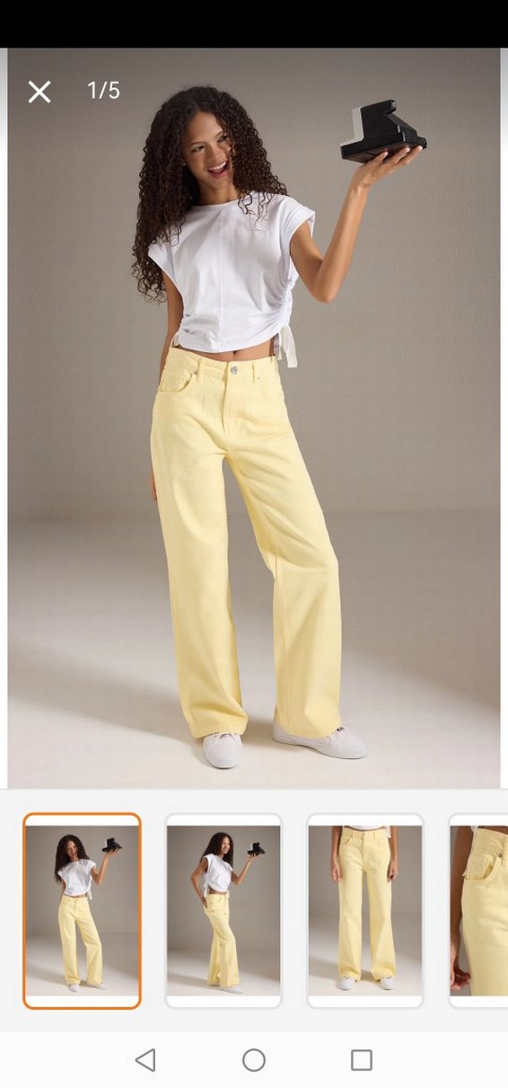 Yumuşak pamuktan üretilmiş, pastel sarı renkte ve hafif batik desenli regular fit midi kot pantolon, günlük kullanıma uygun rahat bir sokak stili sunar.