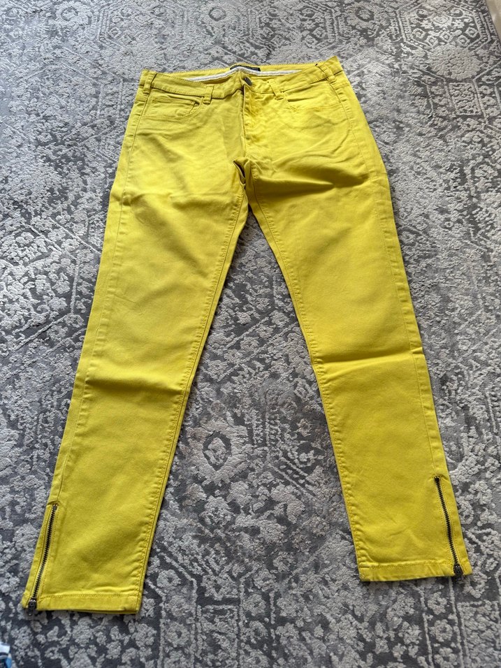 Sarı renk, fermuarlı detaya sahip kadın kumaş pantolon. Orta boy, normal kesim ve yumuşak sentetik kumaştan üretilmiştir. Günlük rahat stil için uygundur.