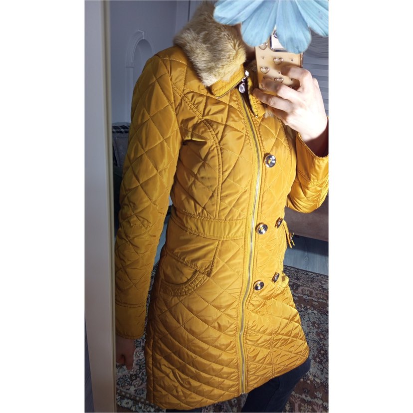 Sarı, kürklü detaylı, uzun kollu, normal midi boyda, sentetik kumaştan, sokak tarzı uyumlu, fitted kesim kadın kışlık mont. en üst yaka dugmesının bırı eksık. ve sağ cep üstü dugmesı de eksık. sol ceptekını yaka ustundekı eksıklıge dıkerek sorunu halledersınız. ek olarak mınık bır lekesı var. kuru temızleme yapıldıktan sonra bır sene gıbı bır süre kaldırılıp bir daha kullanılmamış. uzunluk : 93 cm kol evi genıslıgı: 22 cm göğüs en : 46 cm
