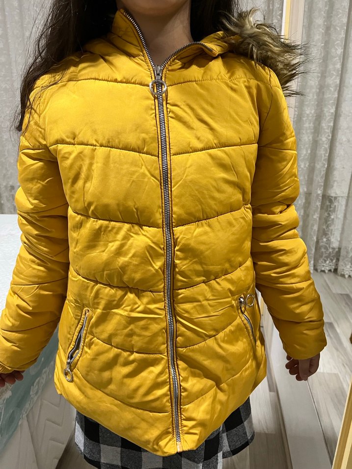Sarı, kürklü kapüşonlu, normal boy midi kaban. Yumuşak ve sıcak kumaştan, parlak görünümlü, fermuarlı ve cep detaylı.