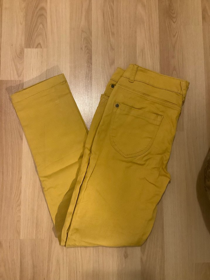 Parlak sarı renkte, normal boy midi kot pantolon, rahat ve günlük kullanıma uygun.
