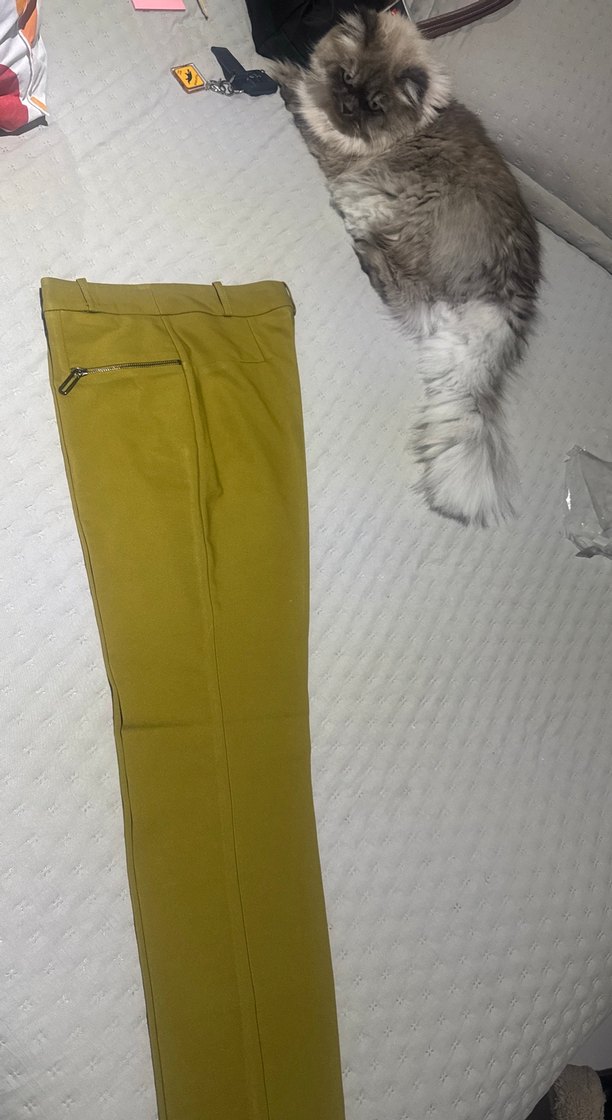 Sarı renk, sentetik kumaştan yapılmış, kürk detaylı ve normal boyda, dar kesim kadın midi pantolon.