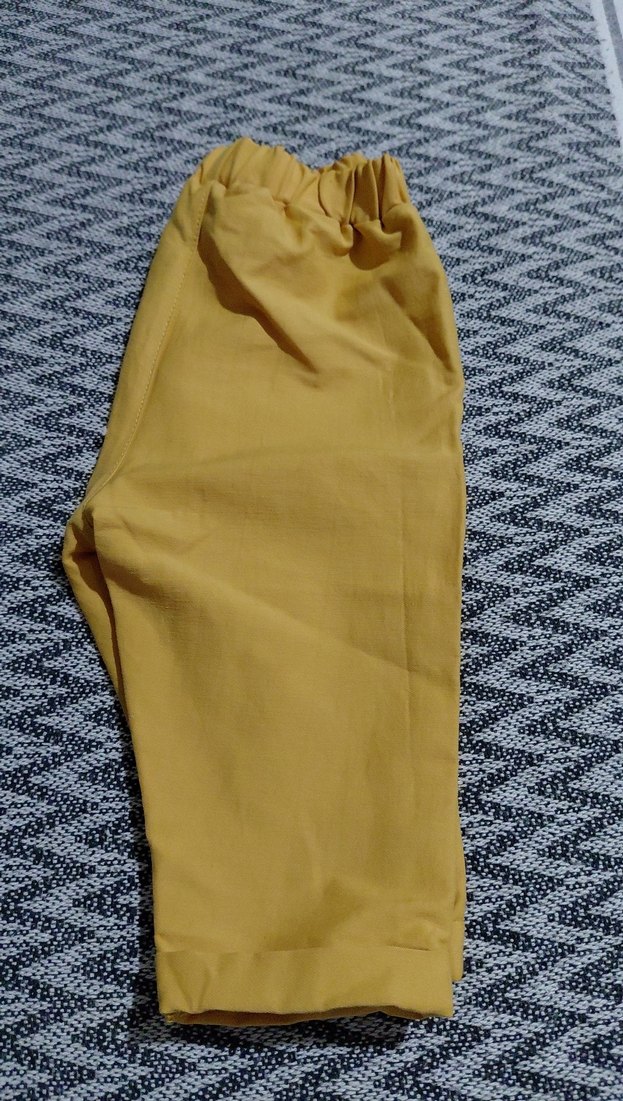 Sarı renkte, elastik bel bantlı kadın midi kumaş pantolon. Düz tasarımı günlük rahat kullanıma uygundur.