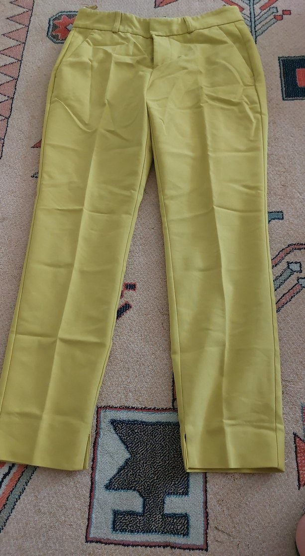 Sarı midi boy,cepli, ayakucu mini yırtmaçlı pilesiz ve düz desenli kadın kumaş pantolon, rahat kesim ve sentetik kumaştan üretilmiştir.