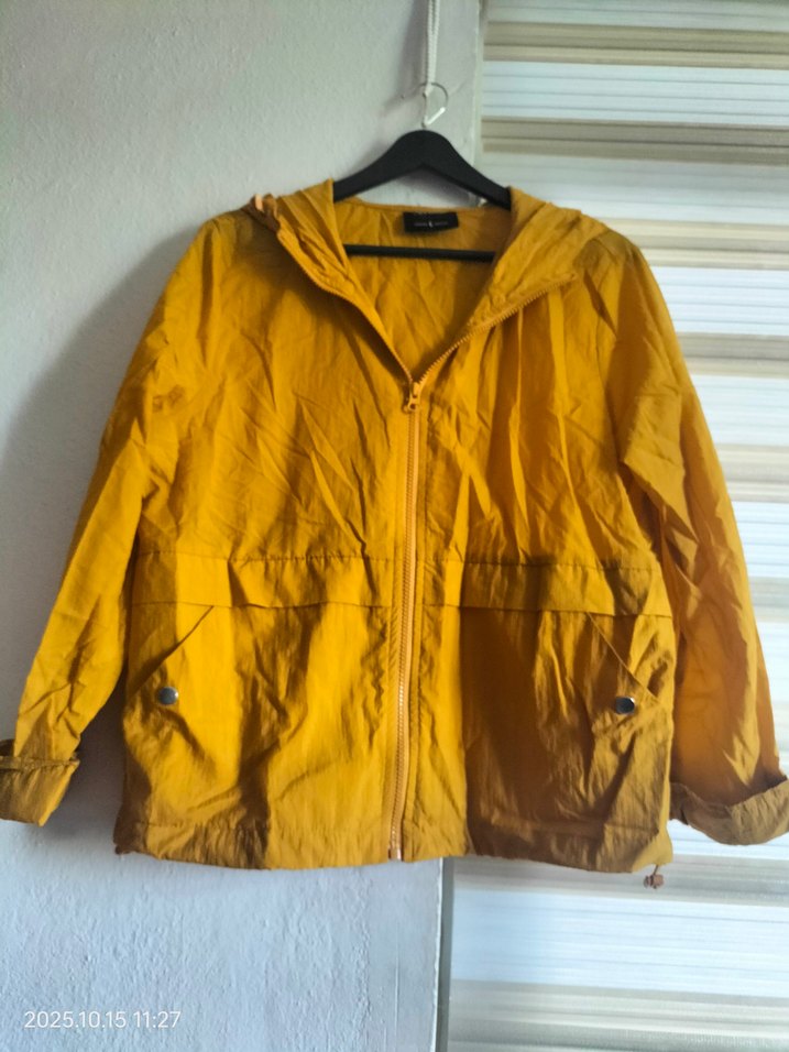 Bu sarı kadın ceket parlak yüzeye, fermuarlı öne, uzun kollara ve bol kesime sahiptir. Notlu yaka yağmurluk üretilmiştir, günlük sokak stiline uygundur.