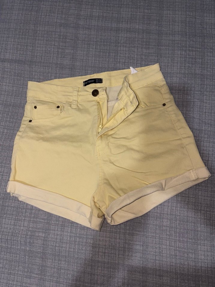 Yumuşak pamuktan yapılmış, pastel sarı renkli, dar kesim mini şort. Katlanmış paçalar ve sade tasarımıyla gündelik sokak stiline uygundur.