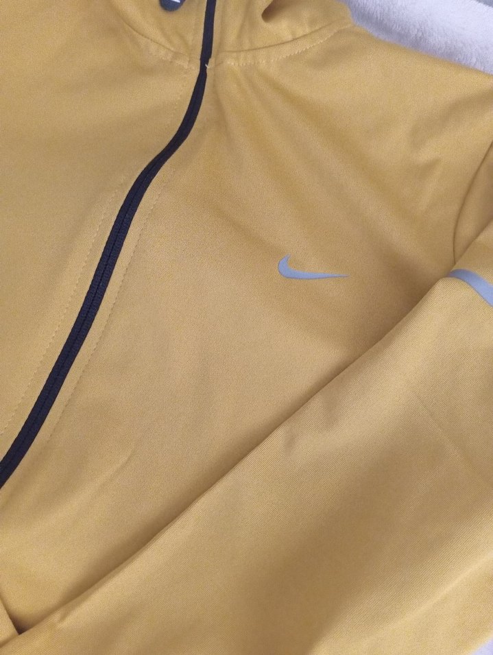 Bu sarı Nike ceketi, parlak sentetik kumaş, V yaka ve uzun kollu, fermuarlı öne sahip. Normal uzunlukta, sportif ve günlük sokak stili için uygun.