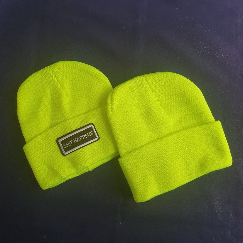 Yumuşak ve sıcak kumaştan, "SHITHAPPENS" yazılı bir yamaya sahip sarı örgü bere. Rahat sokak stili için uygun.
