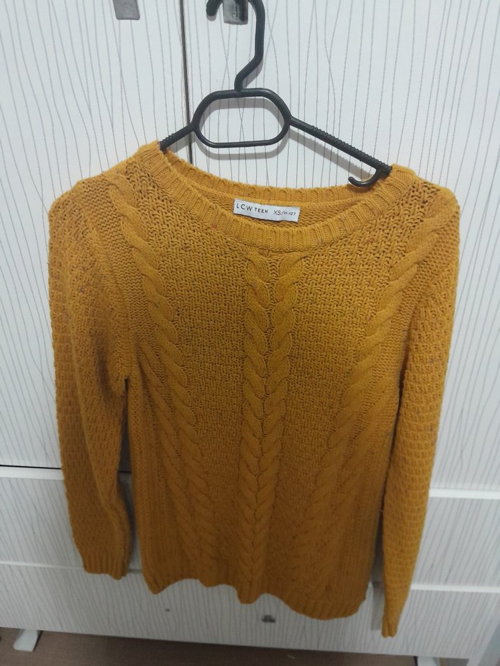 Uzun kollu, yuvarlak yaka, sarı renkli, gevşek kesim örgü kazak. Rahat ve günlük kullanıma uygun normal boyda.