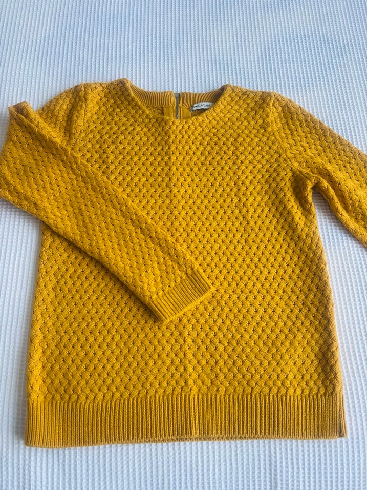 Sarı örgü kadın kazak, uzun kollu ve bisiklet yakalıdır. İnce ve normal boyda, sade ve rahat bir tarza sahiptir, günlük kullanıma uygundur.