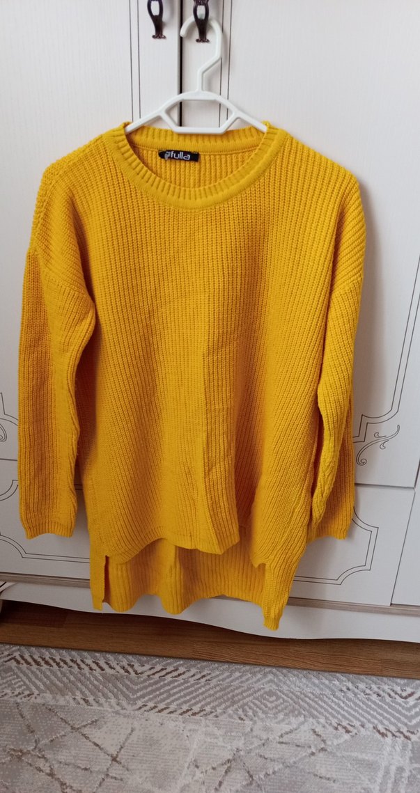 Sarı renkli, örgü dokulu, yuvarlak yakalı ve uzun kollu, bol kesim midi uzunluğunda kadın triko kazak. Günlük kullanıma uygun sade tasarımlı rahat model.