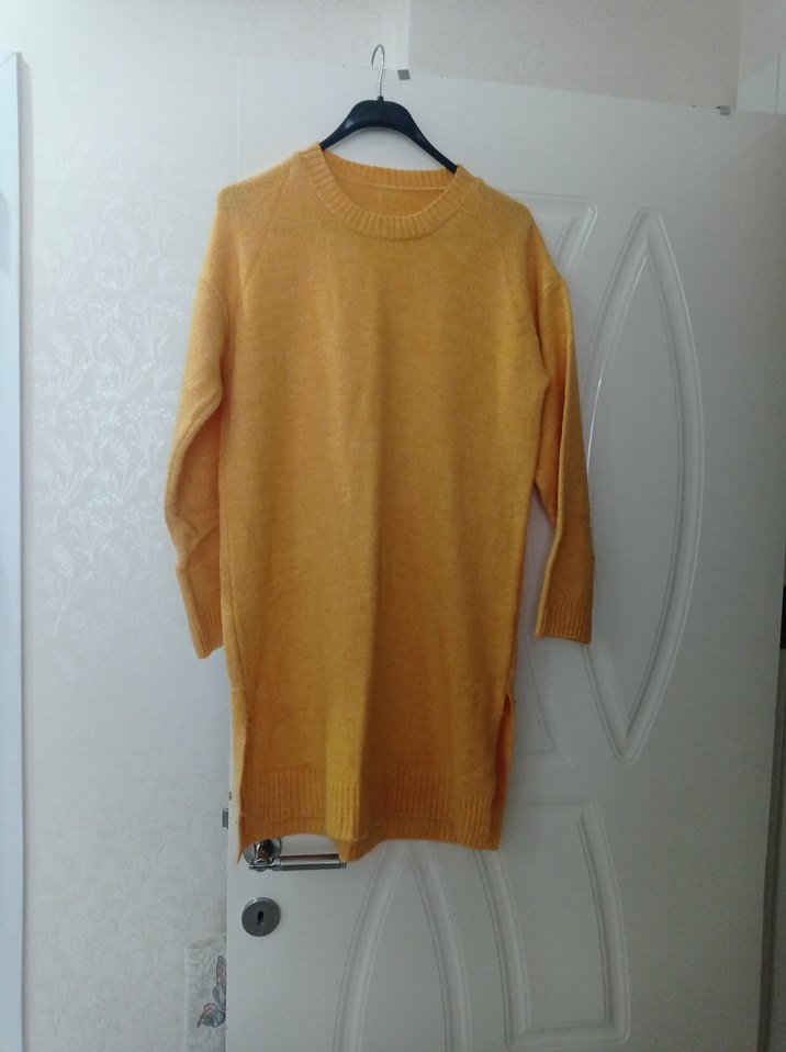 Örme yün, uzun kollu, yuvarlak yakalı, rahat kesim sarı triko. Günlük kullanıma uygun, rahat ve şık bir sokak stili parçası.