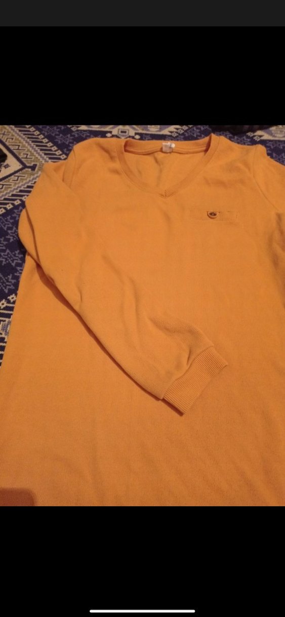 Sarı pamuklu uzun kollu, yuvarlak yaka ve salaş kesim kazak. Normal boyda, günlük sokak tarzı için uygun, parlak görünümlü.