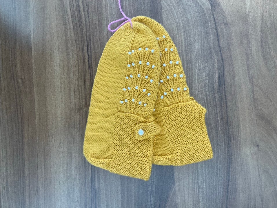 Kız çocukları için sarı renkli, nakışlı detaylara sahip, bohem tarzda örgü patik Düğmeli manşetiyle rahat ve sıcak tutar. Beş şiş ile işlenmiştir