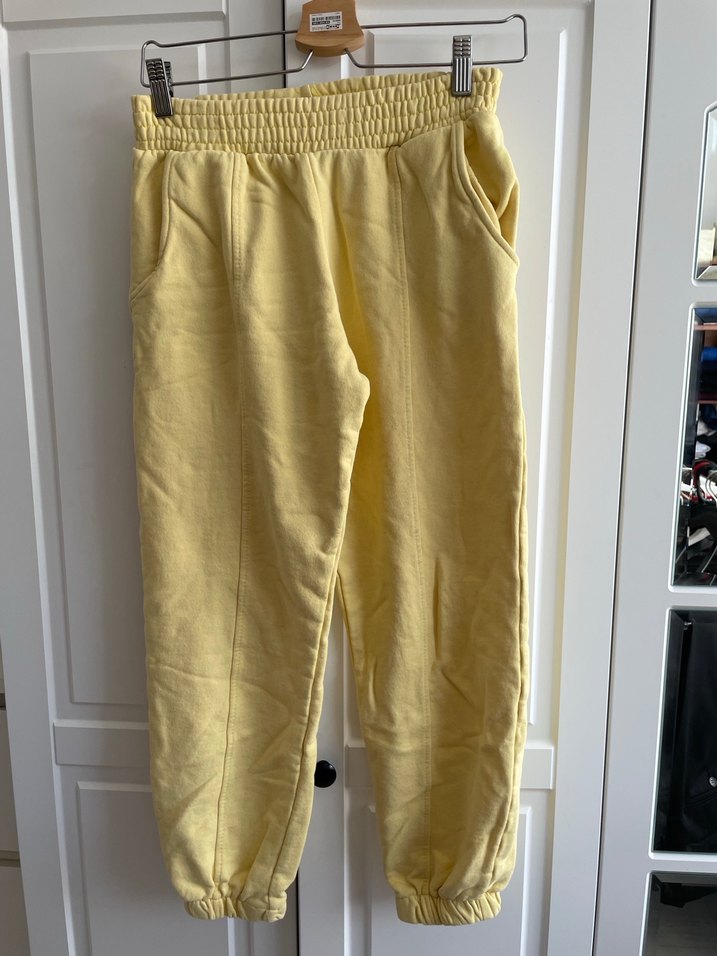 Sarı , rahat kesim ve lastikli bel ile bilek uçlarına sahip midi boy eşofman. Günlük sokak stiline uygun, zahmetsiz şıklık sunar. Kalın kaliteli kumaş sarı eşofman altı. Bilekleri lastikli. Boy 89 cm yandan cepli az kullanılmış Bütün giyim ürünleri toplu satışa açıktır