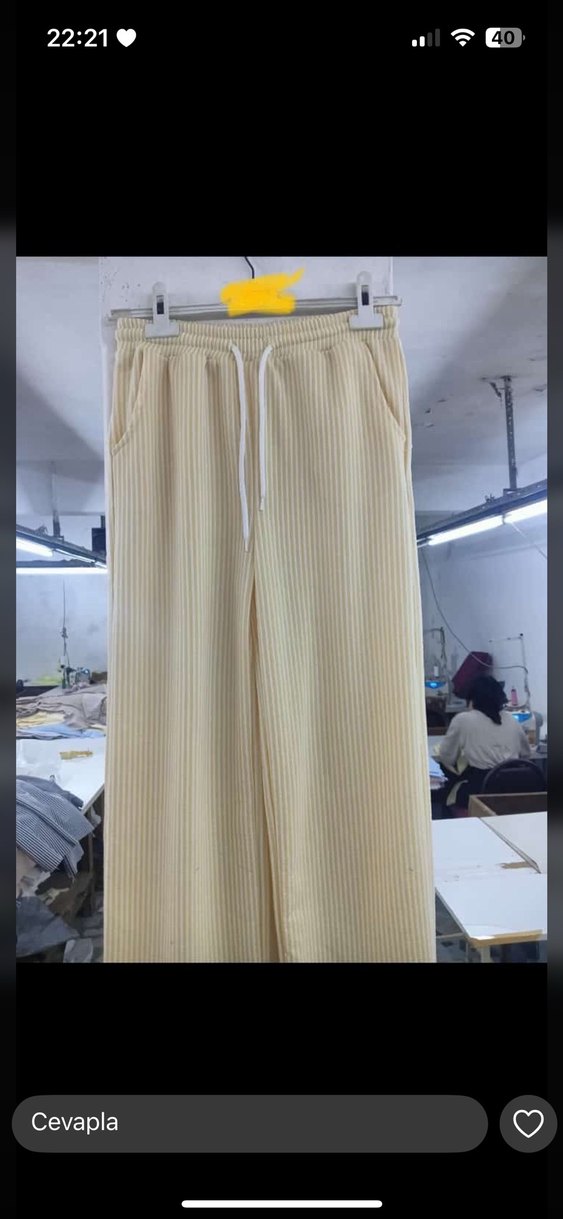 Sarı çizgili ve rahat kesime sahip kadın kumaş pantolon. Uzun boy ve yumuşak sentetik kumaştan üretilmiştir, günlük sokak stili için uygundur. Sarı kahverengi bej mavi pembe siyah renkleri vardır Kendi atölyemizde dikiyoruz s ve xxl arasi bedenler mevcut