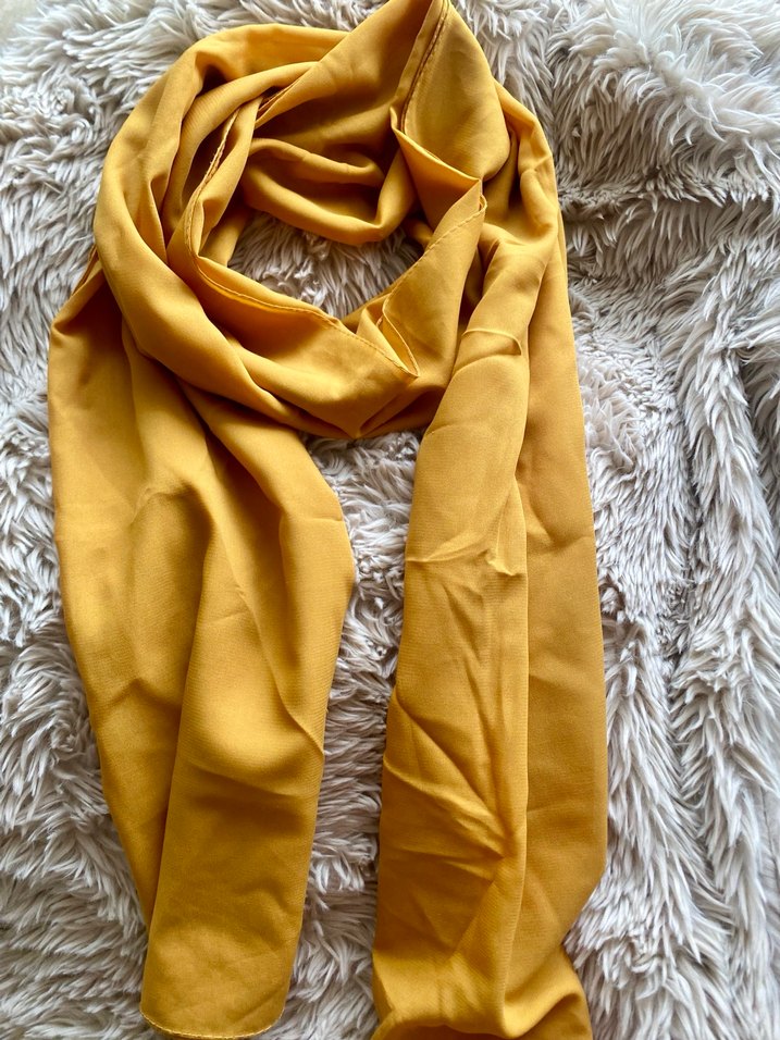 Kadınlar için sarı, parlak ve ipeksi dokulu, drapeli şal. Rahat ve bohem tarzda, yumuşak kumaşlıdır.