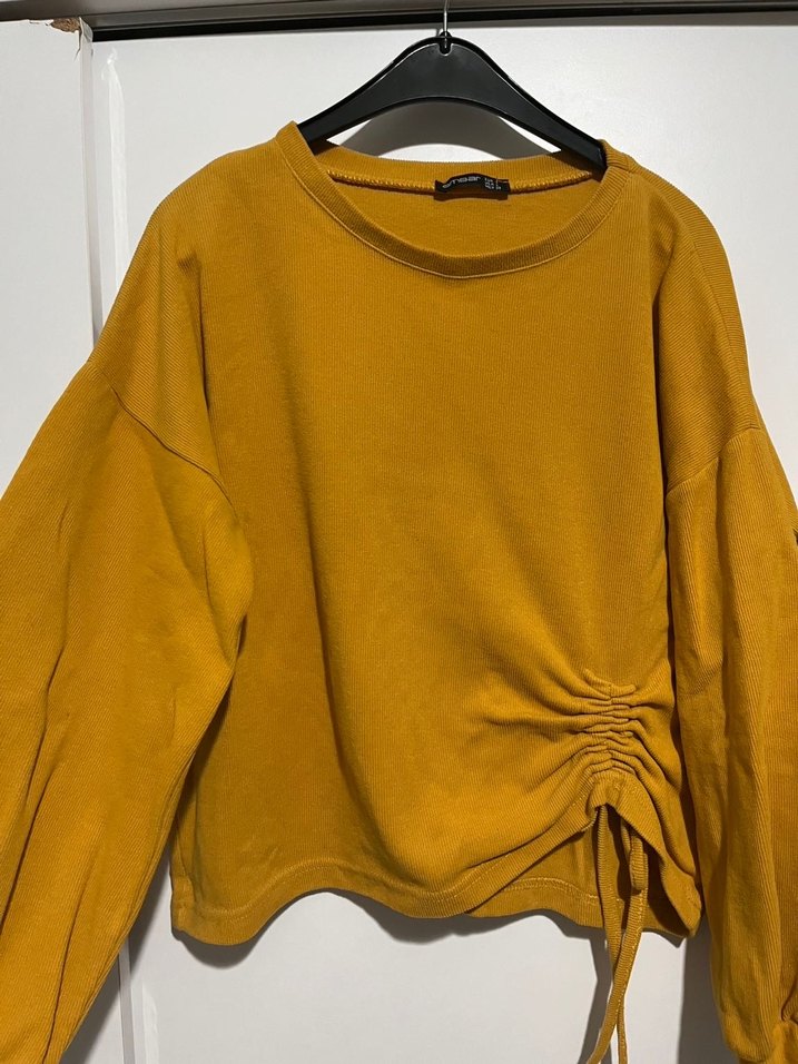 Sarı renkli, yuvarlak yakalı ve uzun kollu kadın sweatshirtü. Rahat kesimi ve yan tarafındaki büzgü detayıyla salaş ve şık bir görünüm sunar. Günlük kullanım için uygundur.