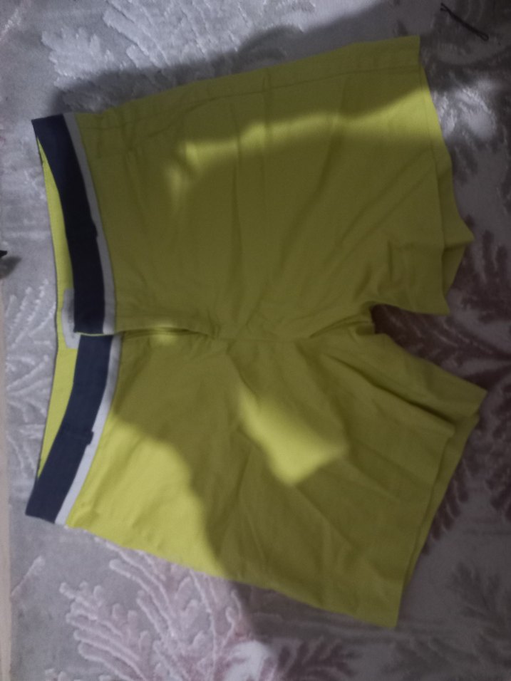 Sarı renkli, sentetik kumaştan yapılmış, pileli ve normal midi boyda, spor ve şık erkek şortu. Streetwear tarzı için uygundur.