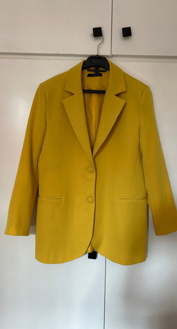 Sarı-açık yeşilimsi süet kumaştan yapılmış, yakalı ve düğmeli kadın blazer ceket. Normal uzunlukta ve regular fit, ofis ve günlük kullanım için uygundur.36 beden fakat 38-40 bedene daha uygun olur.