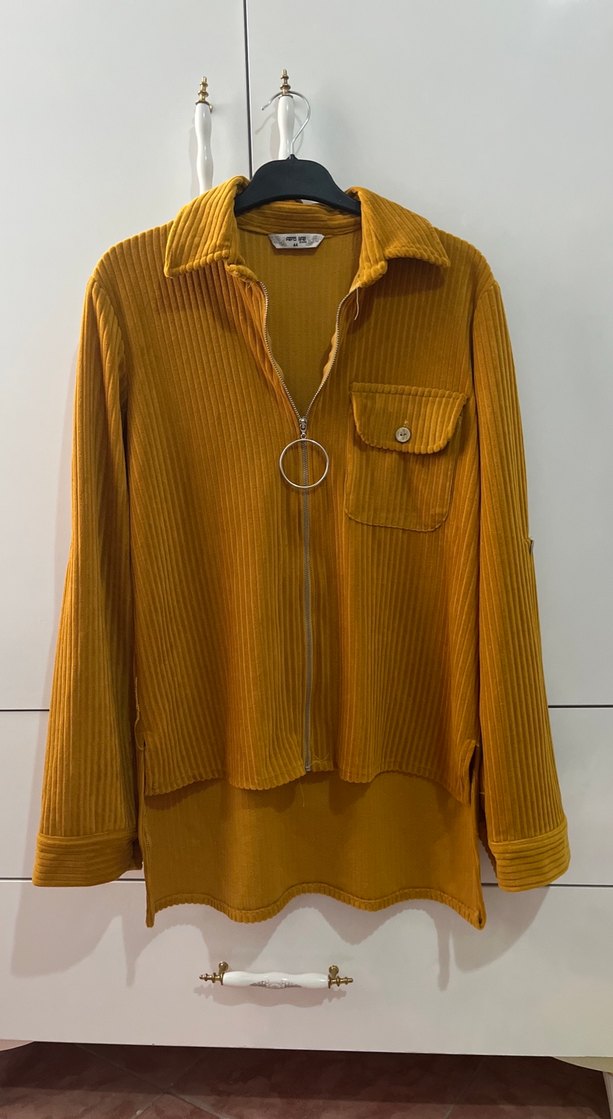 Sarı renk, süet kumaştan yapılmış, uzun kollu ve düğmeli gömlek. Salaş kesim ve normal boyda, günlük rahat sokak stili için uygundur. ✨