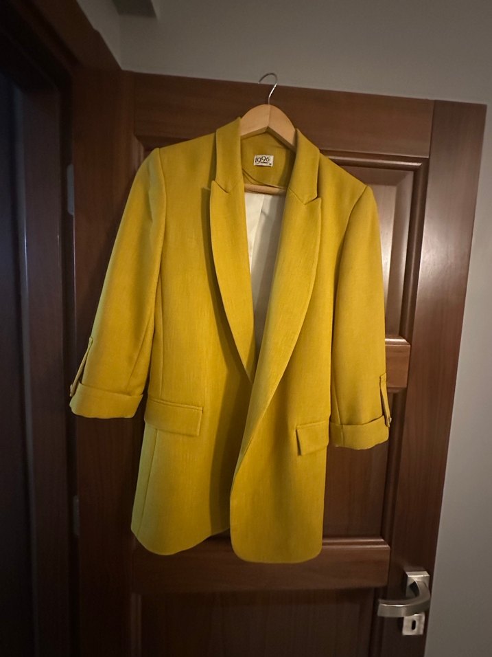 Sarı süet kumaştan yapılmış, düğmeli uzun kollu, normal kesim midi blazer. Ofis ve günlük sokak stili için uygundur. ✨