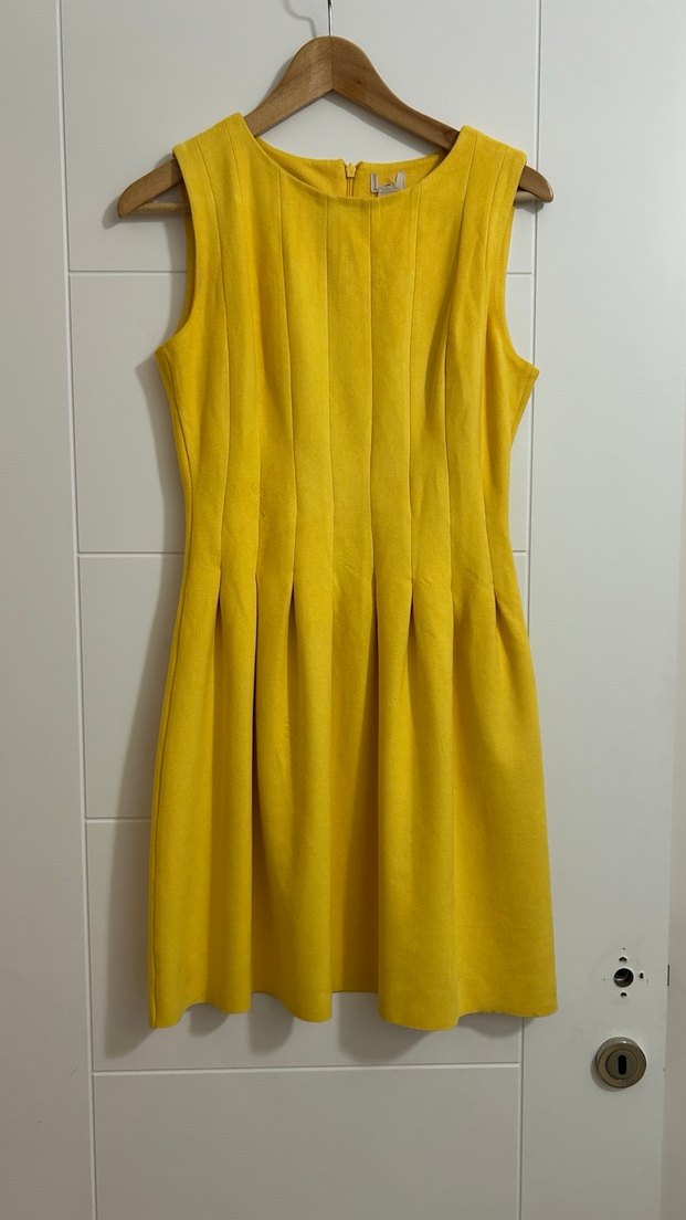 Sarı renkli, süet kumaştan, pilili ve yüksek yakalı, kolsuz, fitted kesim midi elbise. Minimalist ve modern tarz için uygun.