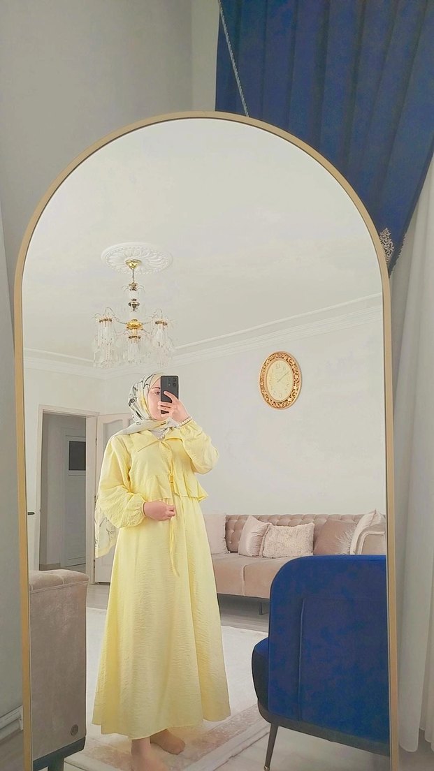 Yüksek yakalı, uzun kollu, şeffaf detaylı, pastel sarı renkte, sentetik kumaştan üretilmiş bol kesim uzun elbise. Günlük ve sade kullanıma uygun.