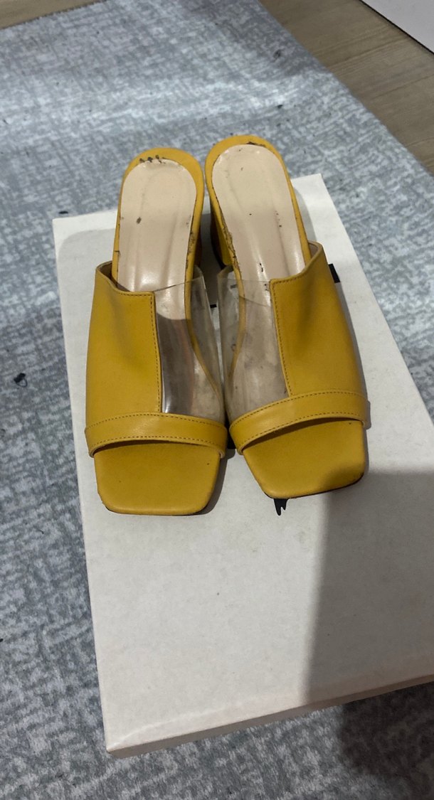Sarı renkli, lastik malzemeden yapılmış, tokalı ve blok topuklu kadın terliği. Minimalist ve çağdaş tasarıma sahip, günlük kullanıma uygun.