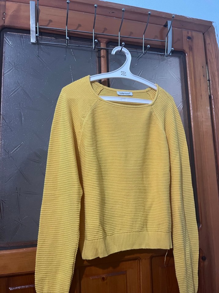 Sarı renkte, uzun kollu, bisiklet yaka ve normal boyda, bol kesim örme kadın kazak. Minimalist ve desensiz tasarımı gündelik kullanıma uygundur.