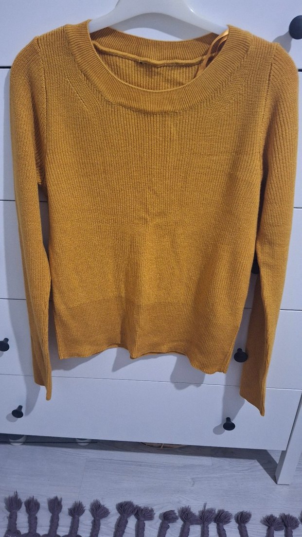 Sarı renkli, bisiklet yaka, uzun kollu örme triko kazak. Salaş kesimli ve normal boyda, günlük rahat sokak stili için uygun.