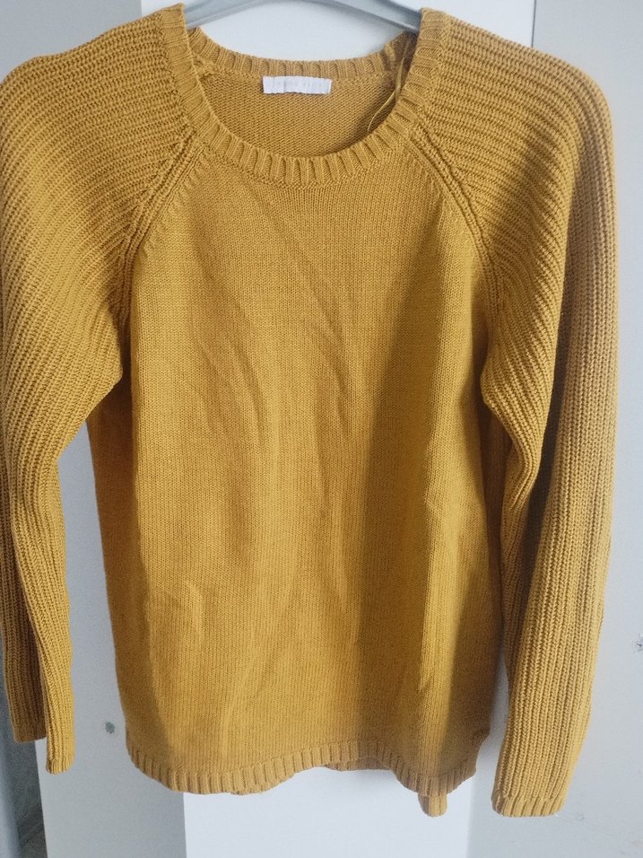 Sarı renkli, yuvarlak yaka ve uzun kollu örme triko kazak. Rahat kesimi ve normal boyu ile günlük sokak stiline uygun.
