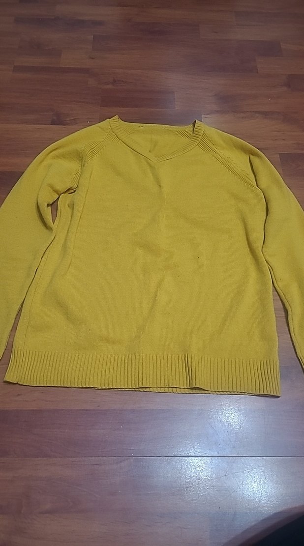 Açık sarı renkli, yuvarlak yakalı ve uzun kollu triko kazak. Rahat kesim ve midi boy uzunluğunda, günlük kullanım için uygun.