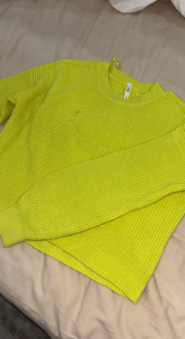 Sarı renkli, uzun kollu, yuvarlak yaka ve bol kesim triko kazak. Rahat ve sade tarzıyla günlük kullanım için uygundur.