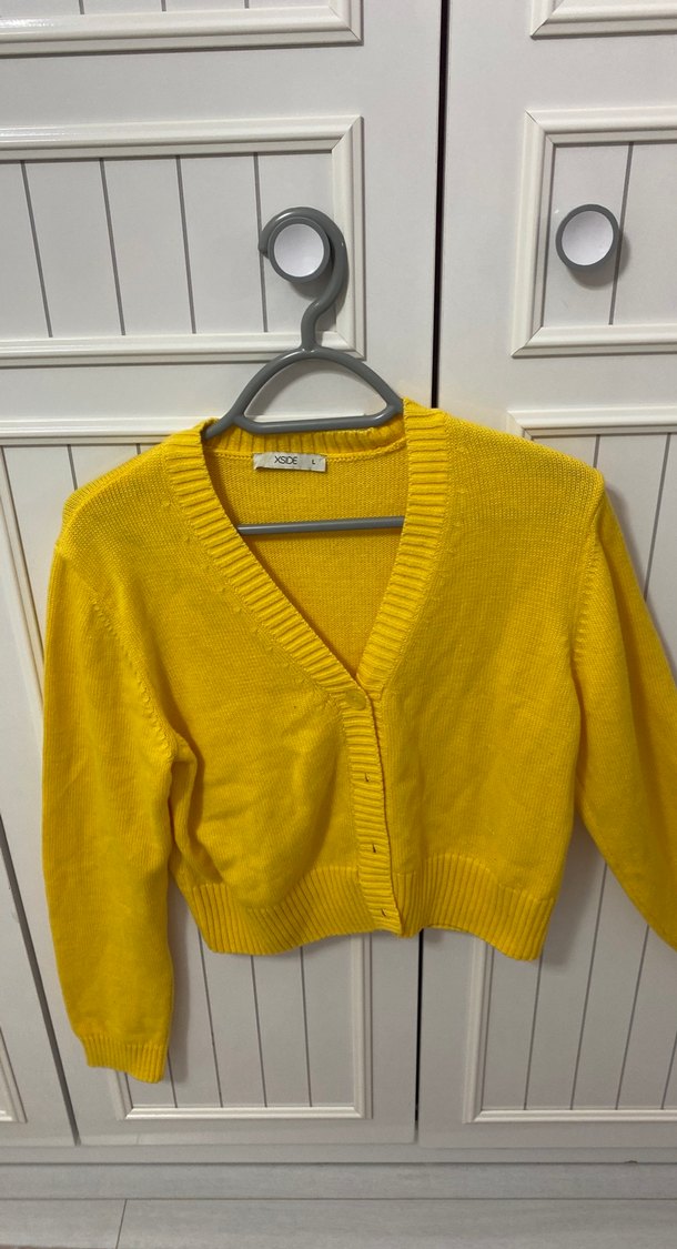Sarı renkli, uzun kollu ve yuvarlak yakalı triko kazak, rahat ve şık bir görünüm için vücuda oturan kesime sahiptir. Günlük kullanıma uygun, normal uzunluktadır.