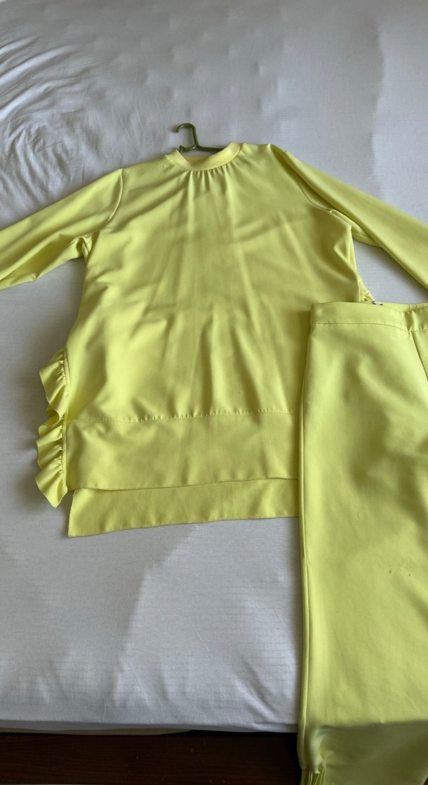 Sarı renkte, uzun kollu ve bisiklet yaka kadın eşofman takımı. Yan tarafında fırfır detayı bulunan, parlak ve şık görünümlü, günlük kullanıma uygun. Sadece 3 kez giyidli.Fotografta gösterildiği gb ufak takılmalar var 2 yerde. Birde ugak bi lekesi hiç yıkanmadıgı için çıkartmaya uprasmadım o yüzden bu fiyata satışta
